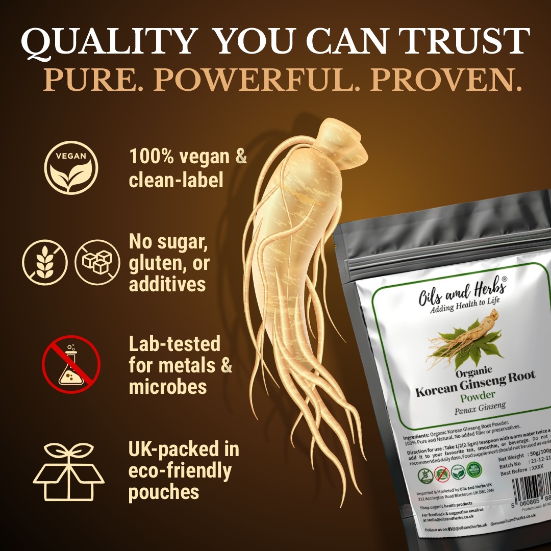 Recharge your mind and body with our Organic Ginseng Root Extract Powder, standardised to contain a potent 20% Ginsenosides – the powerful active compounds known for their energy-boosting, cognitive-enhancing, and adaptogenic benefits. Sustainably sourced and expertly extracted, this is a premium herbal supplement for anyone seeking natural vitality and resilience.