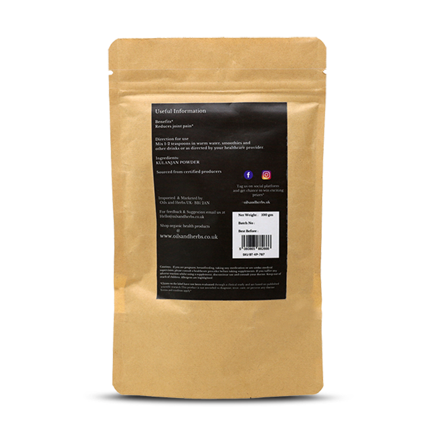Greater Galangal/ Kulanjan powder is native to India and has been used in ayurvedic medicine for centuries. It has also become more and more popular all over the world. The botanical name for it is Alpinia Galanga and it is commonly known in English as the great galangal.