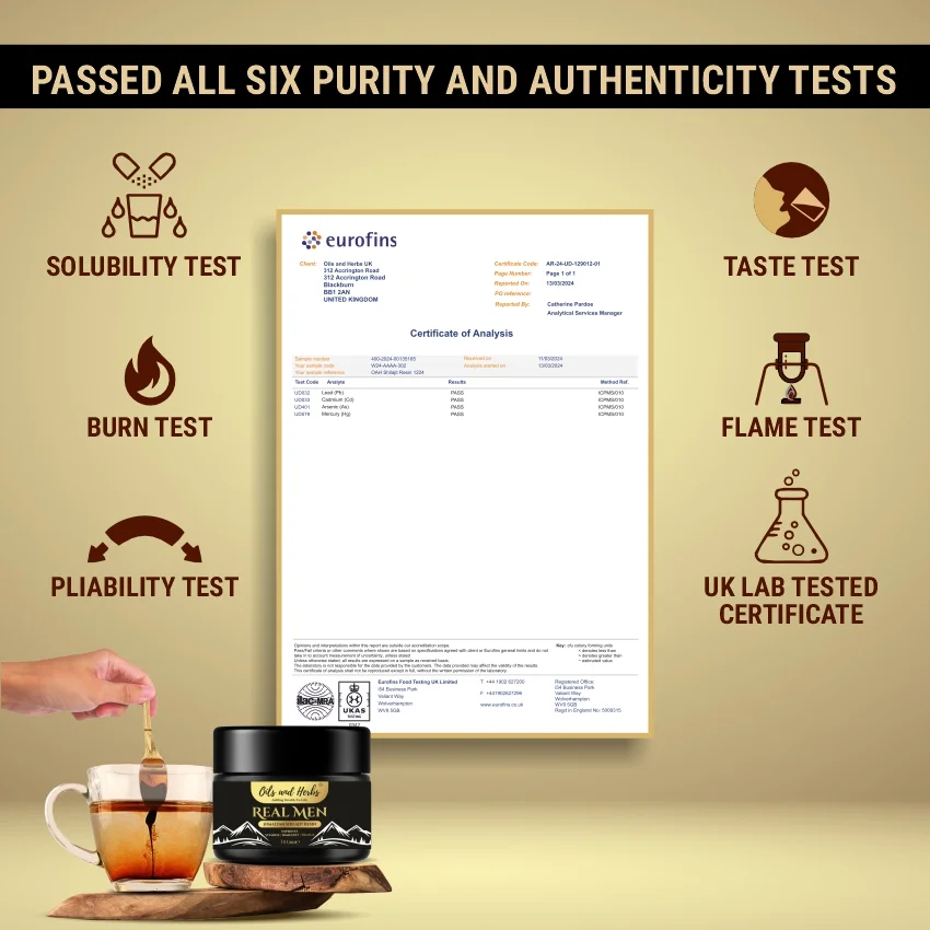 For ultimate assurance, we provide a Certificate of Analysis with every batch. This document, issued by an Euro Fin laboratory for heavy metal test , verifies our Shilajit authenticity, purity, and compliance with quality standards- Passed