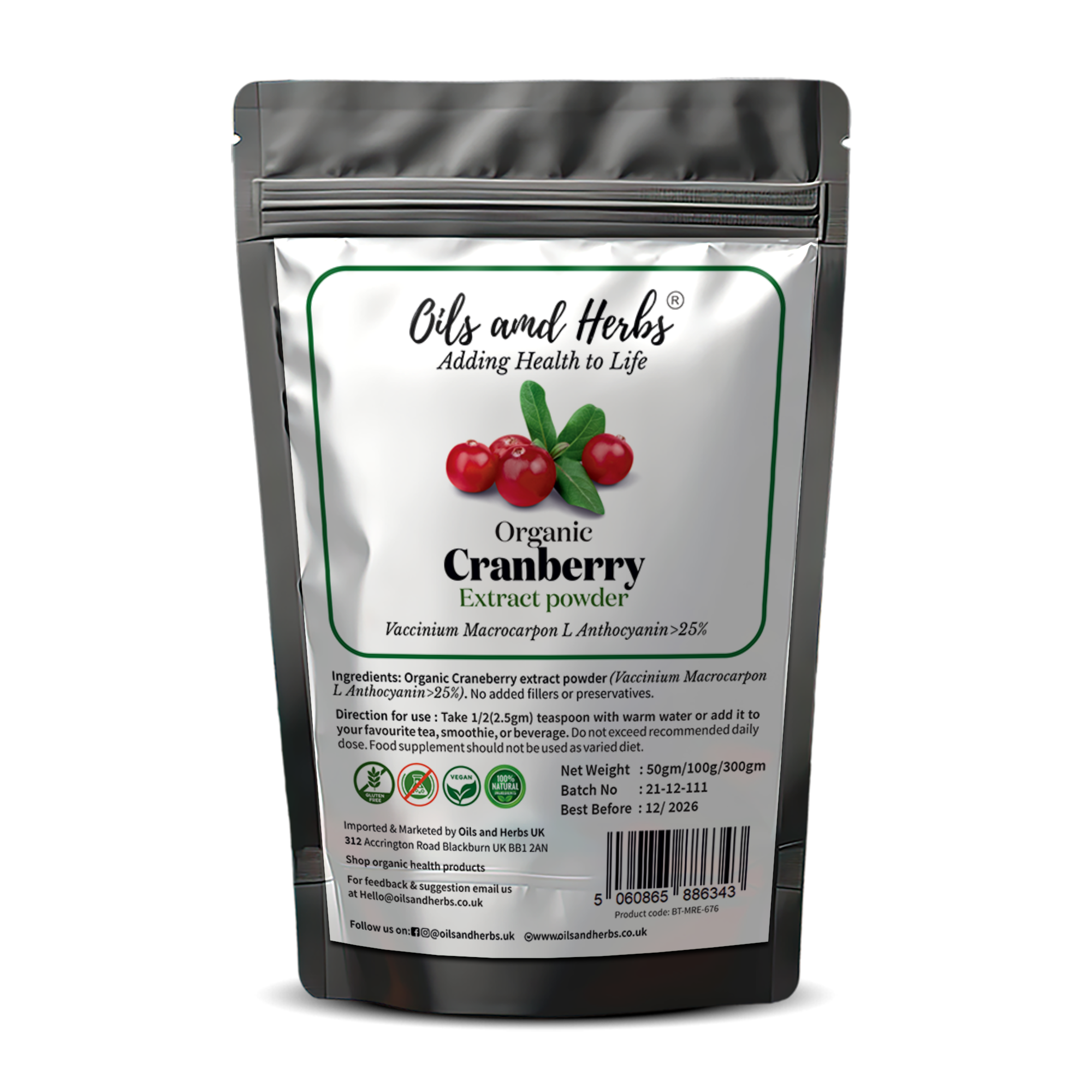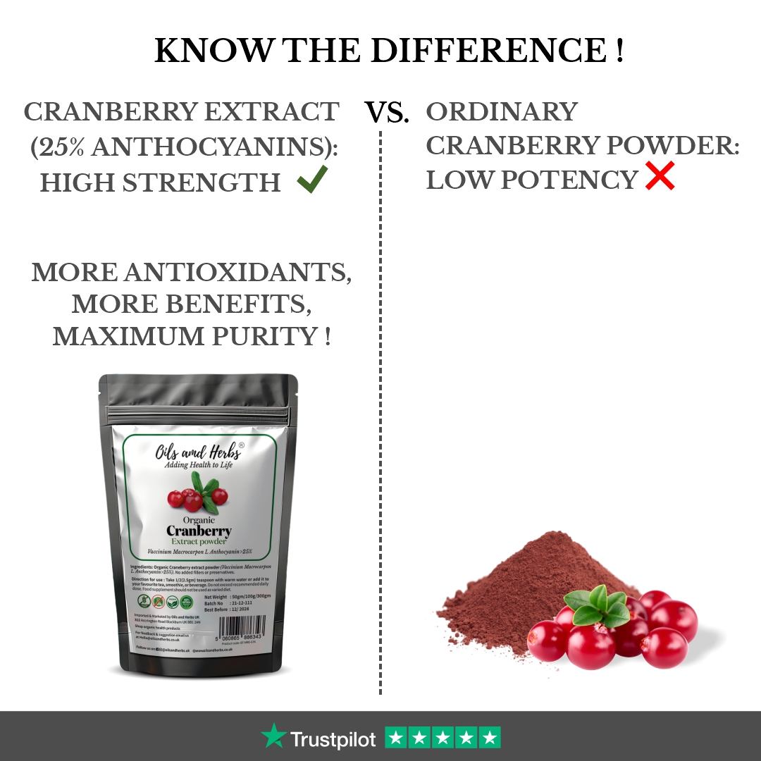 Our Cranberry Extract Powder is sourced from certified organic producers, ensuring the highest purity and potency. It contains >25% Anthocyanins, making it a powerful natural antioxidant. Free from sugar, artificial colours, and flavours, this premium extract is a clean and natural choice for your wellness needs.