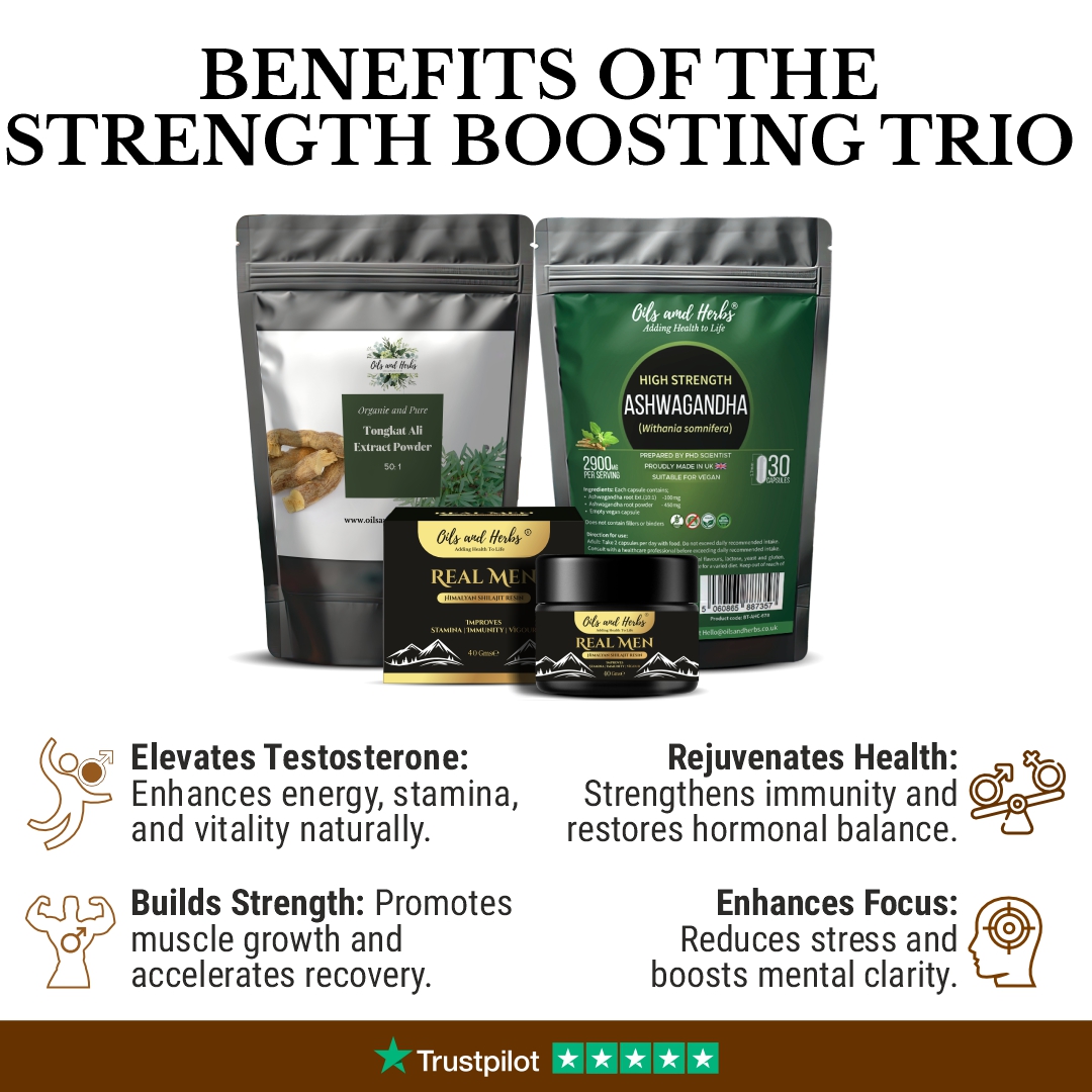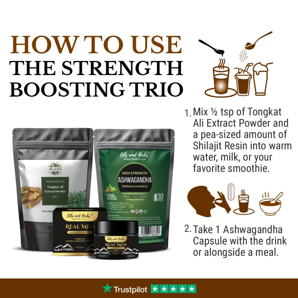 The Strength Boosting Trio is a winning combo! Shilajit, Ashwagandha, and Tongkat Ali together have noticeably enhanced my physical performance and mental well-being. Definitely sticking with this powerful trio!